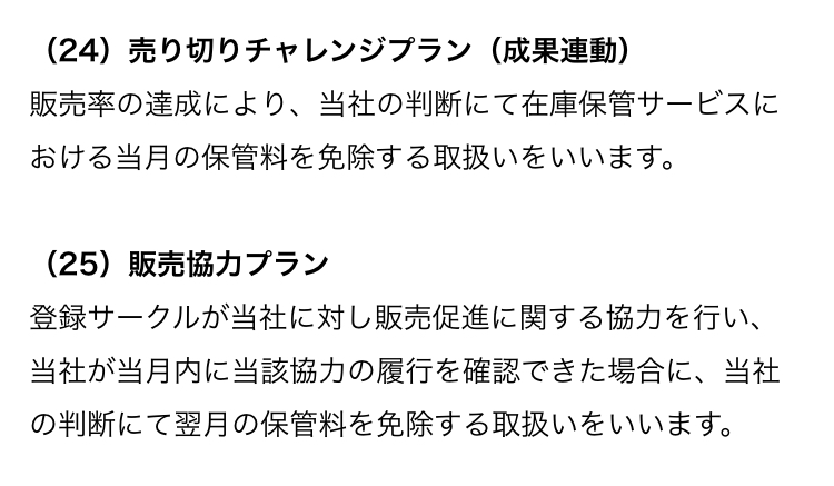 ⬛︎保管サービスの経過措置 (1)在庫保管サービス適用は、本規約改正日である令和8年4月1日以降に保管を開始した委託販売対象作品に対して適用されます。 (2)本規約改正日である令和8年4月1日以前に委託販売を開始している作品の在庫保管の取扱いについては、なお従前の例によるものとし、委託期間終了後、保管サービス利用または返本、廃棄等を選択できるものとする。尚、在庫保管サービスにおける保管料は当該作品の委託期間終了日の属する月の翌月から発生するものとする。 ・1ヶ月に在庫の60%以上売れない場合は保管料が最低でも550円かかる。 ・入荷日は月末より月初の方がいい?