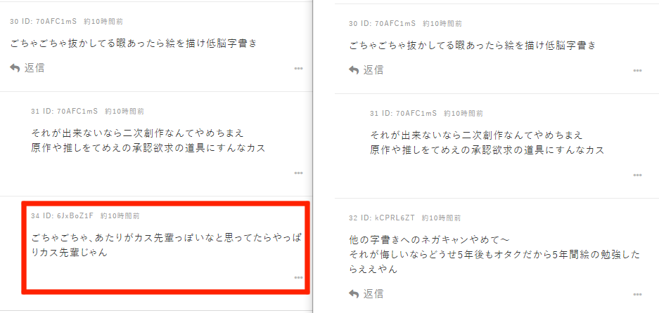 アホエロは原作リスペクトしてないから書かないって意見の後に人の創作をディスらないって意見が続いてるの最高に人間性の違いを感じる