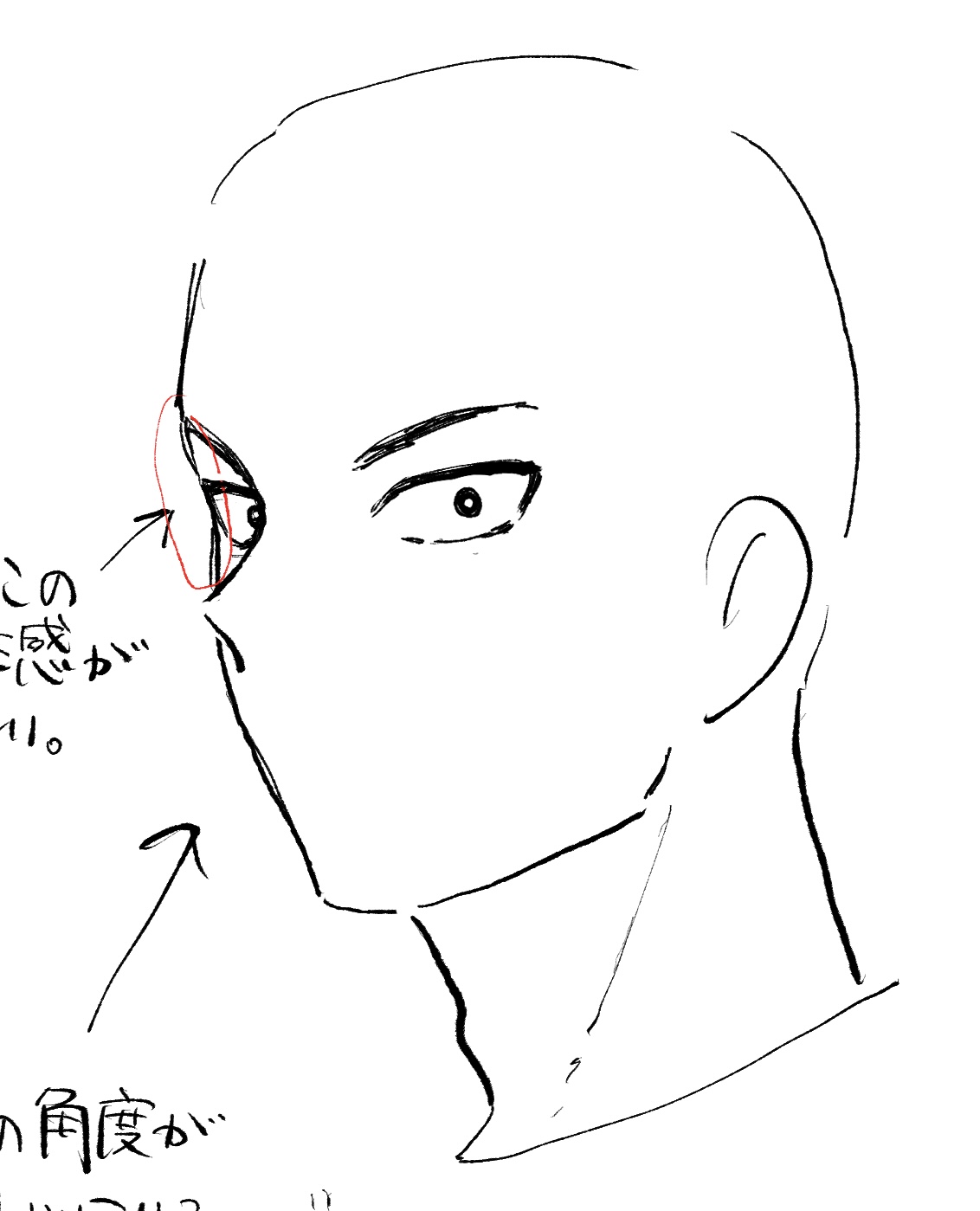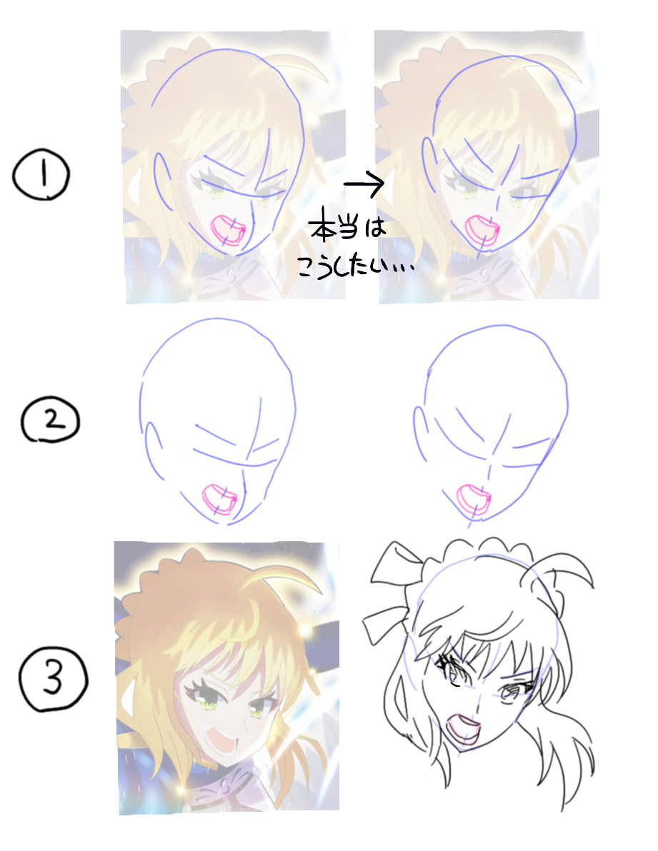 2、下絵なしのアタリ線のみ。顔の向きを口の向きに合わせるような感じです。