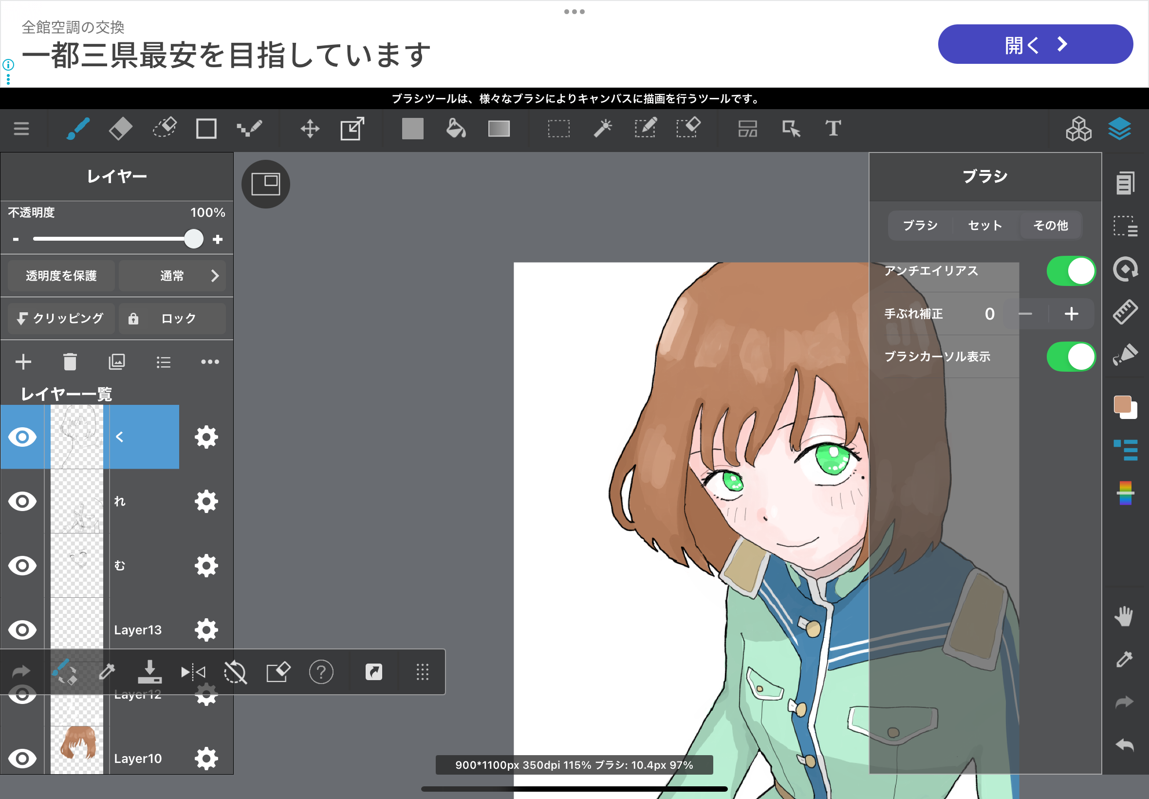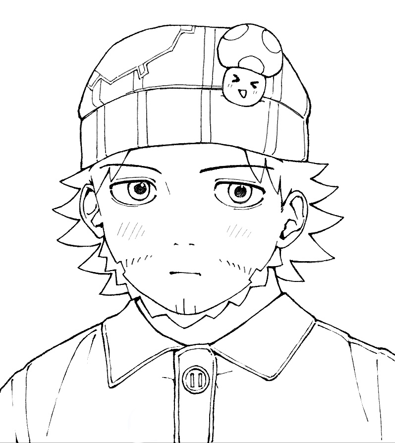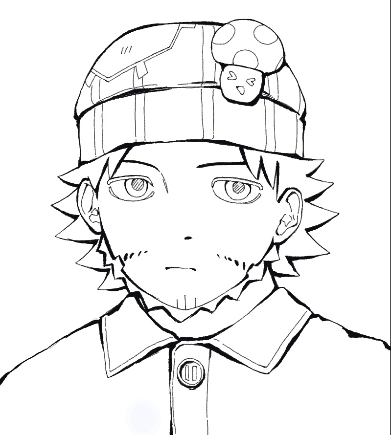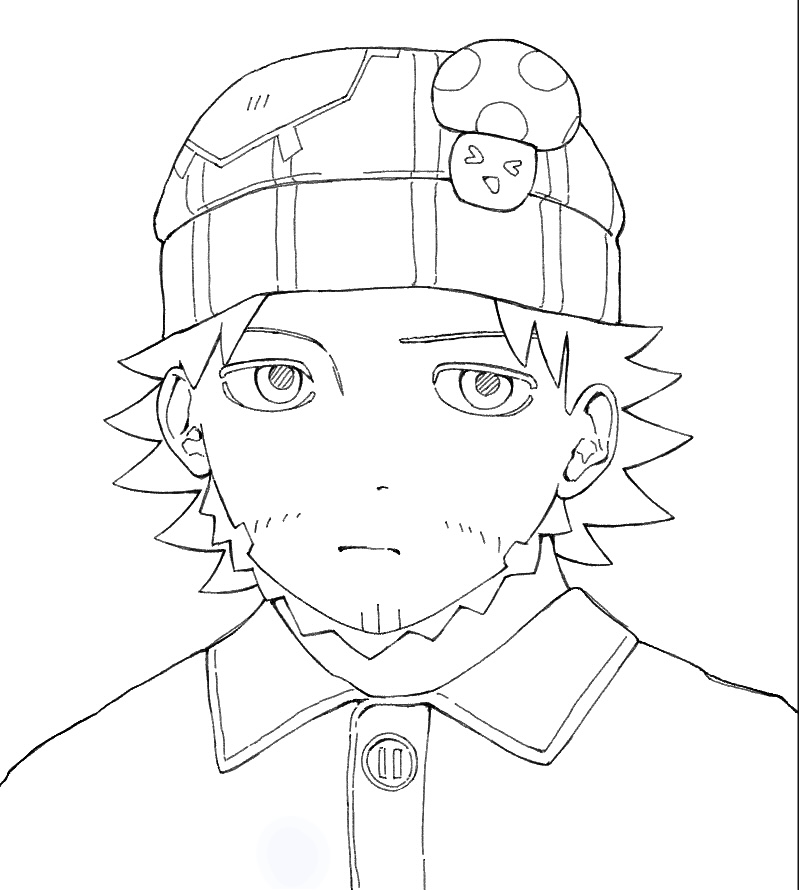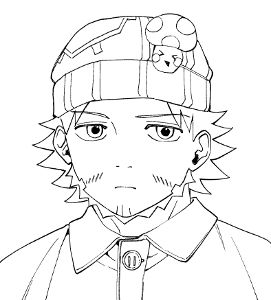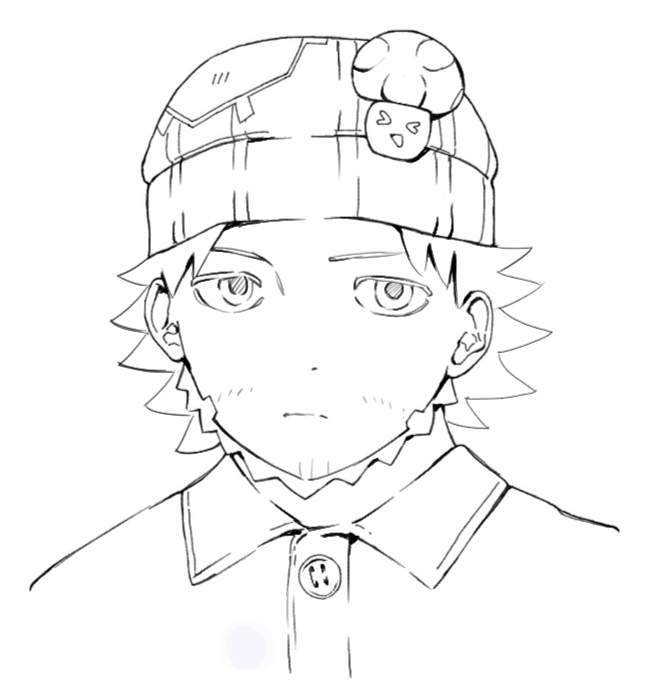 ・顔の描くパーツも提案通り位置を調整。眉毛がしっかりしたキャラなのでしっかり描きます。眉毛の内側をもう少し下げて逆八の字にするだけで「迫力のある表情」になります。
