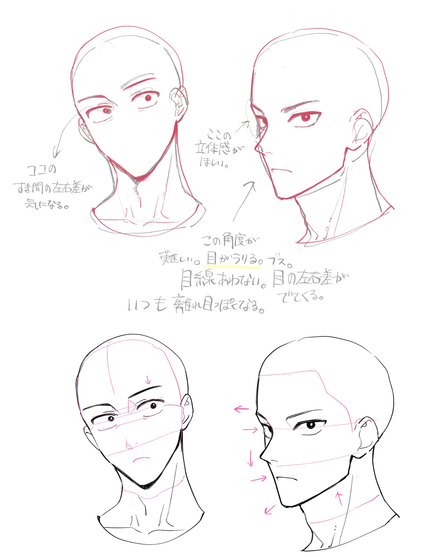 1、アタリ線を顔の向きに合わせて描いてみます。口の上下に中心線を加えどれだけ顔の中心からズレてるのか分かりやすくしました。トピ主は「大きく開いた口で迫力のある表情を演出したい」という意識が強すぎて、口を正しい位置に置くことに集中できてないと思います。「いや、口はこれくらい大きく広げたいんだよ」という気持ちに応えて、それらしいアタリ線を右側に用意しました。口と顔の中心線がそろってるので違和感がないと思います。