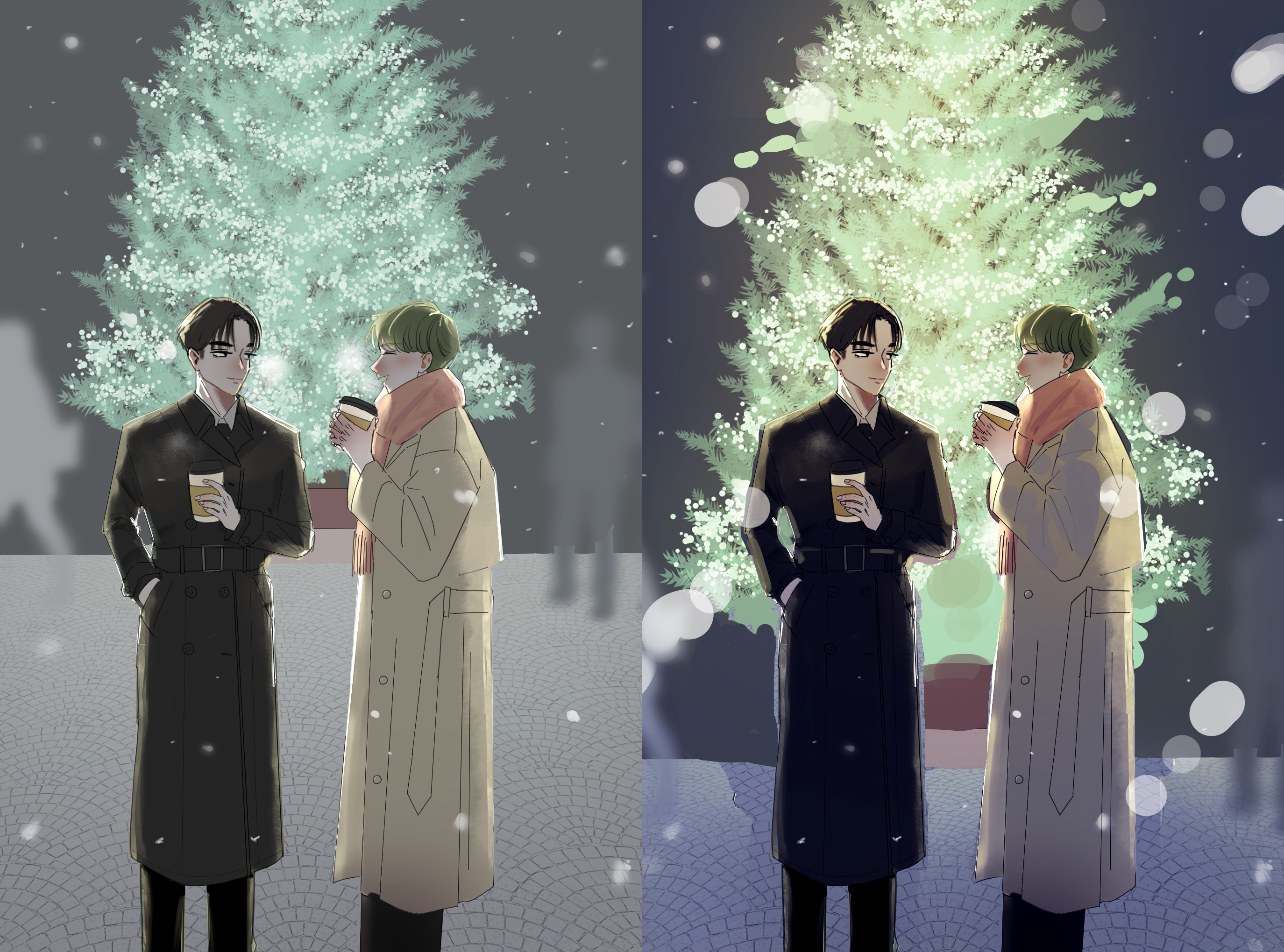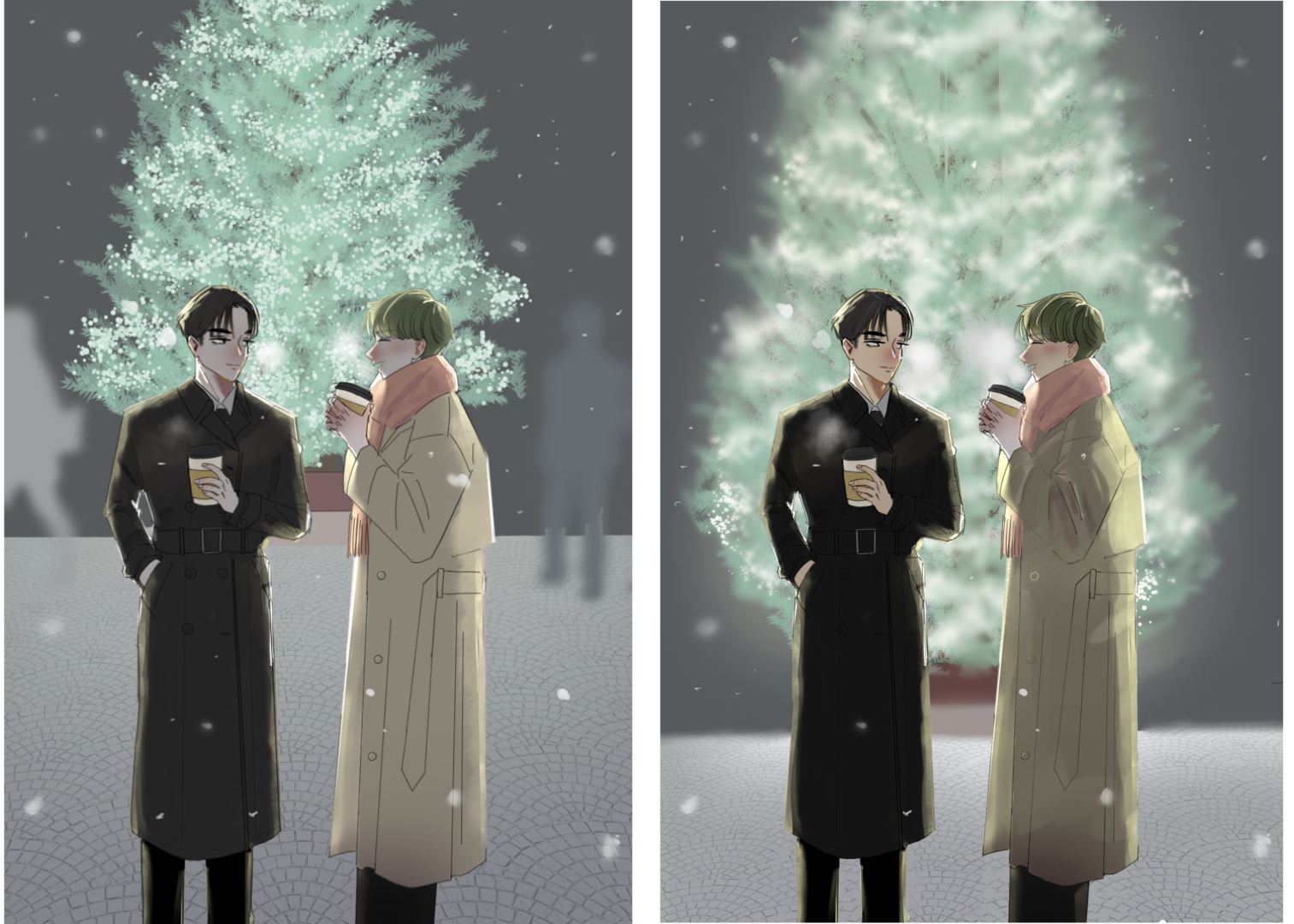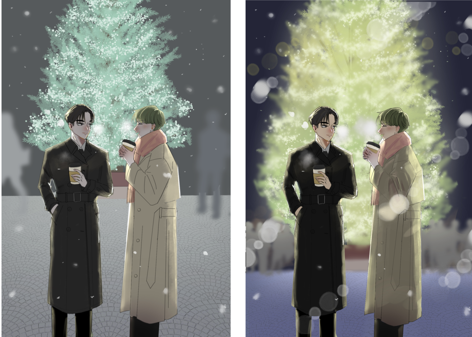 添削後のイラストみると途端に自分の絵がくすんで見えますね…添削後の絵は、寒さやイルミネーションの温かみが感じられてとても素敵です( ; ; )