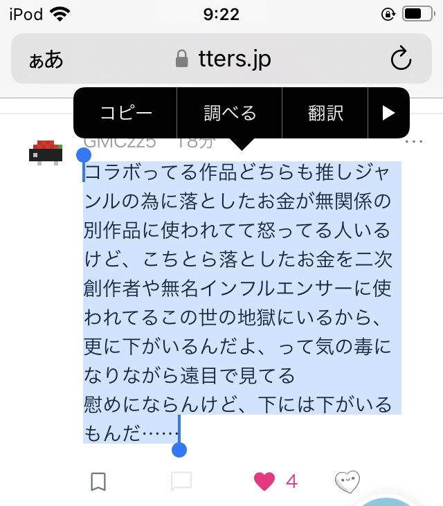 コラボってる作品どちらも推しジャンルの為に落としたお金が無関係の別作品に使われてて怒ってる人いるけど、こちとら落としたお金を二次創作者や無名インフルエンサーに使われてるこの世の地獄にいるから、更に下がいるんだよ、って気の毒になりながら遠目で見てる